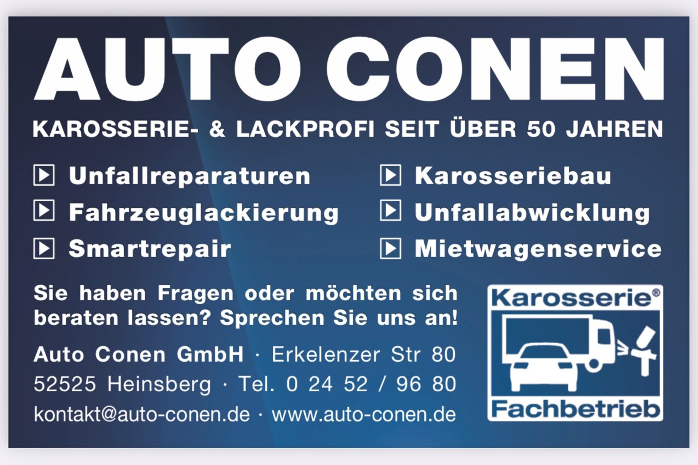 Das Unternehmen Auto Conen steht seit über 55 Jahren für Tradition und Vertrauen. Davon sind auch unsere Kunden überzeugt und honorieren dies mit langjähriger Treue. Unsere Leidenschaft zum Automobil reicht zurück bis zur Gründungsphase im Jahr 1967, wo Kurt Conen mit einem Karosserie- und Lackierbetrieb in Heinsberg-Dremmen den Grundstein für das heutige Unternehmen legte und uns dadurch zu einem der größten Fiat Vertragshändler in Deutschland machte. Als Familienbetrieb in der zweiten Generation bieten wir Ihnen auf 25.000 qm ein breites Angebot an Fahrzeugen verschiedenster Marken. Als BOSCH Servicepartner bieten wir zudem einen umfassender Full-Service an markenunabhängigen Werkstattleistungen. Karosserie arbeiten in der eigenen Großlackiererei runden unser Angebot ab und werden von zertifiziertem Fachpersonal durchgeführt.